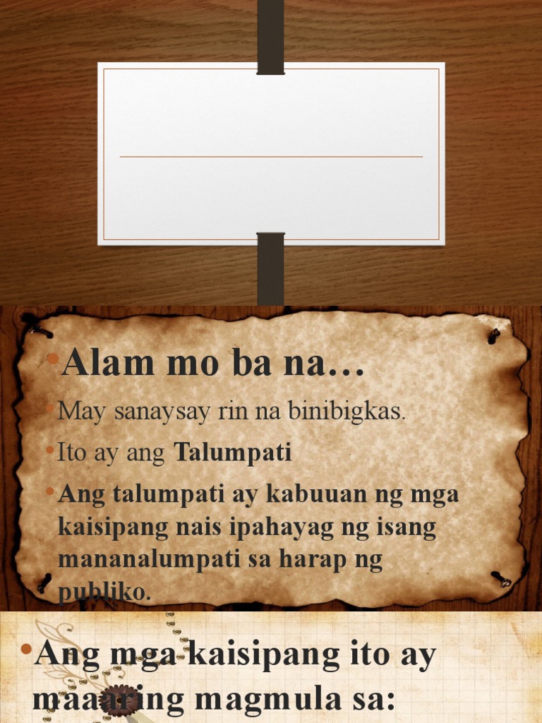 Opinyon Ito ay isa ring buod ng kaisipan o opinyon ng isang tao na pinababatid sa pamamagitan ng pagbigkas. ANG SANAYSAY NA BINIBIGKAS O TALU APATI ito ay kabuuan ng mga kaisipang nais ipahayag ng isang mananalumpan sa harap ng publiko. Ang mga sanaysay ay maaaring magkaroon ng mga element ng pagpuna opinyon impormasyon obserbasyon kuru-kuro pang-araw-araw na pangyayari ala-ala ng nakaraan at pagmumuni-muni ng isang tao.